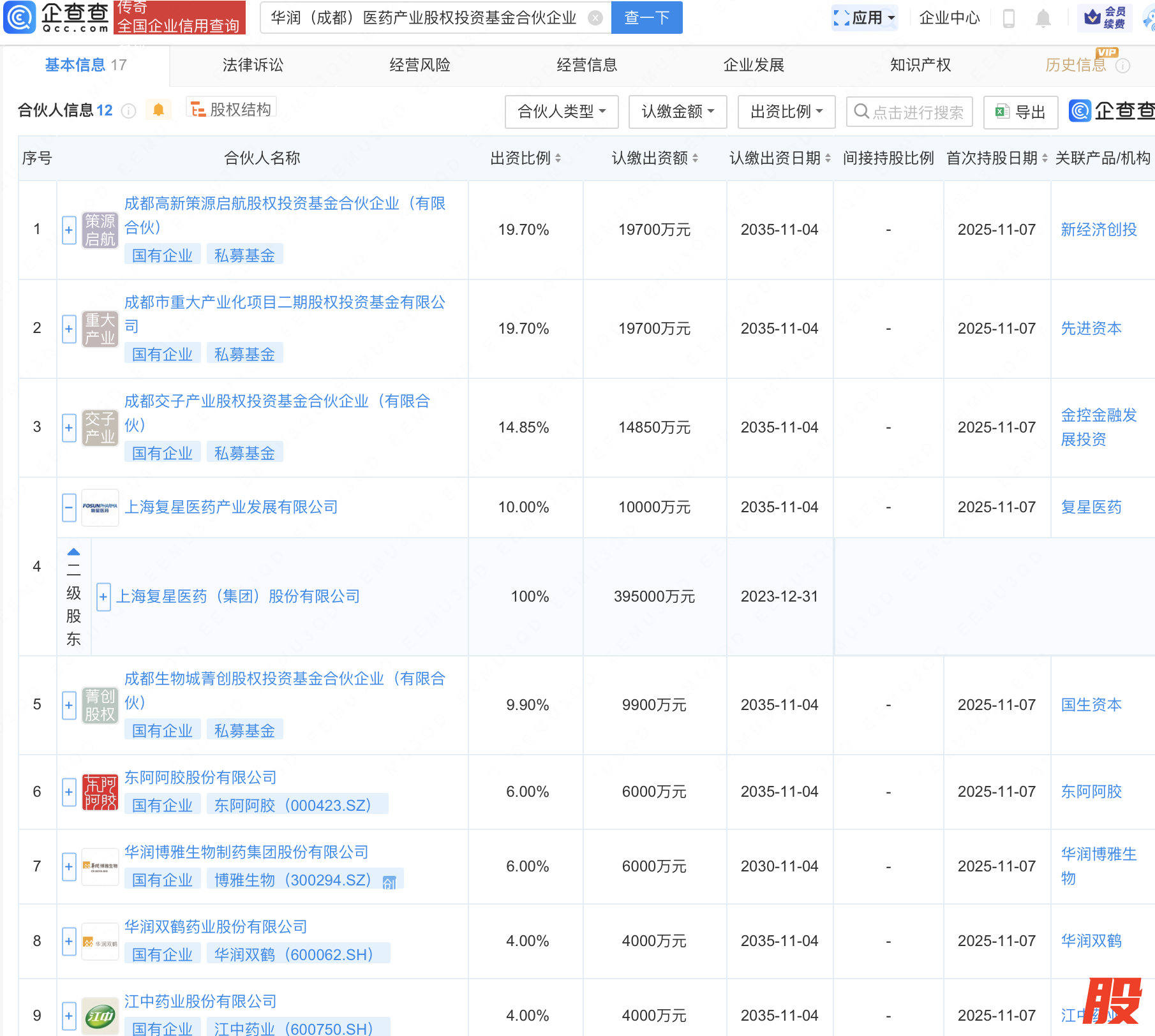 近日,华润(成都)医药产业股权投资基金合伙企业(有限合伙)成立,出资额10亿元,经营范围包含:创业投资(限投资未上市企业)。企查查股权穿透显示,该企业由复星医药(600196)全资子公司上海复星医药产业发展有限公司、东阿阿胶(000423)、博雅生物(300294)、华润双鹤(600062)、江中药业(600750)等共同出资。