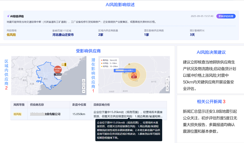 以地震风险为例,启信慧眼能够实时推送震中、震级、受影响供应商等关键信息,标出预计影响时长,并结合历史地震数据与专业评估模型,预测对供应链的潜在冲击,给出具体决策建议。比如某地发生3.8级地震,AI会综合多维度信息进行风险评级,明确标注出“两家供应商受影响、预计影响时间3天”等重要信息,同时给出企业应立即核查当地供应商生产及物流路线、启动备货计划以缓冲价格上涨风险、对震中50公里内关键供应商开展设备安全评估等决策建议。